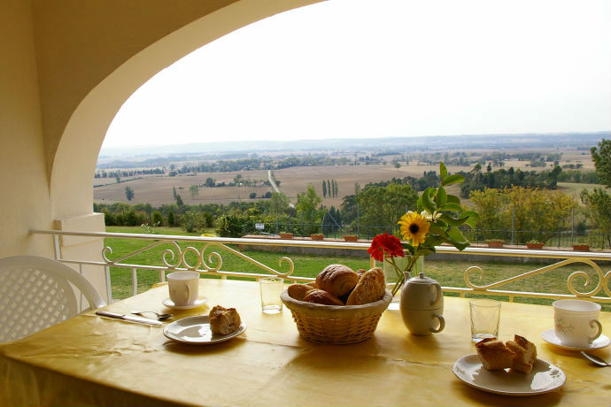Cet appartement orienté plein sud se prolonge par une terrasse couverte avec vue sur les Pyrénées. Celle-ci lui a donné son nom. L'accès se fait par un escalier intérieur qui donne dans la cour.