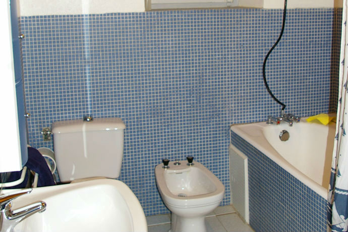- Salle de bain avec lavabo, baignoire, WC, lave-linge.