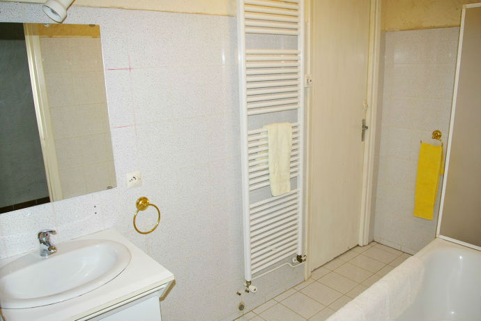 - Salle de bain avec lavabo, baignoire, WC, lave-linge