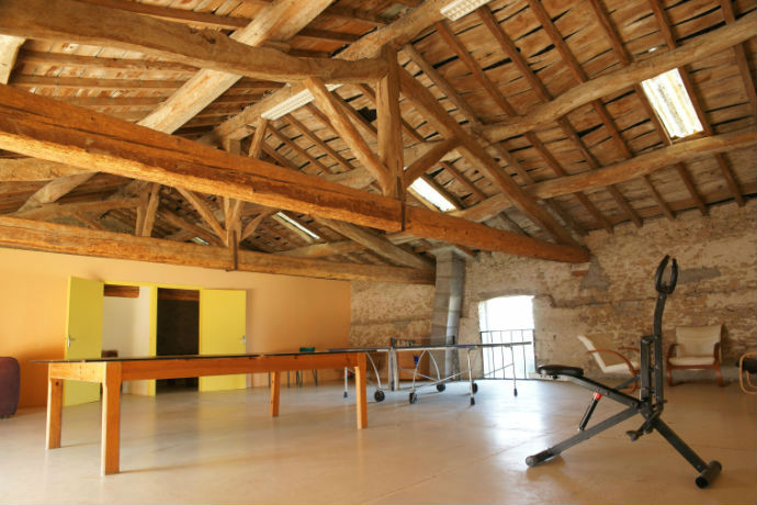 Above the reception room, under a beautiful frame, the table tennis tables are set up and there is a TV room.