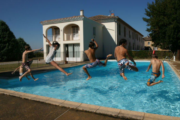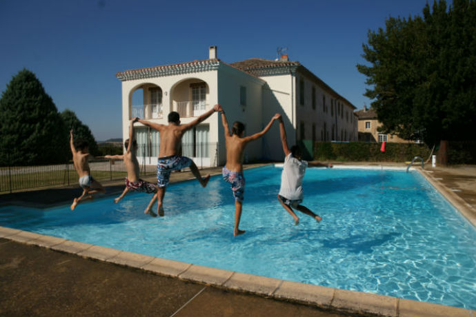 The swimming pool measures 16 x 8 m with a wrought iron fence (23 x 14 m and 1.38 m high). It is surrounded by large open areas. It contains 250 m3 of water. On one side, to allow diving it is 2.5 m deep.